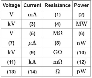 Express your answer as units in terms of the voltage, current, resistance, and power separated by commas.