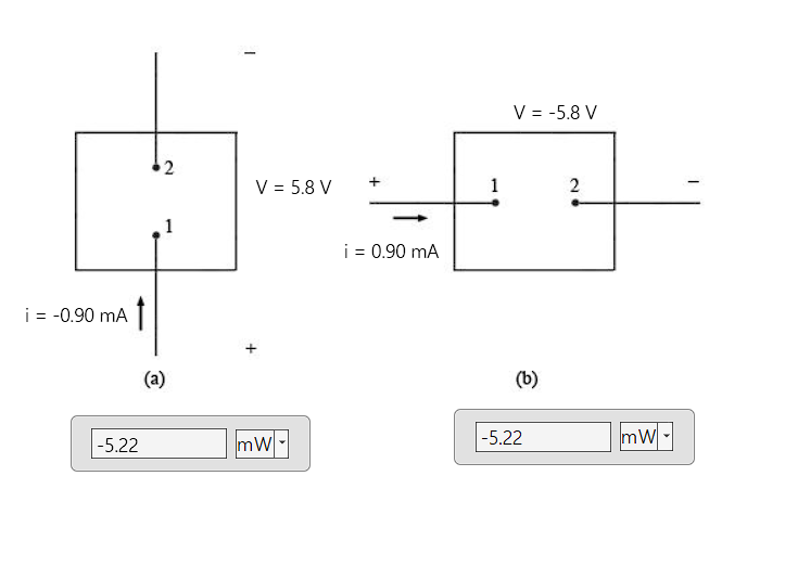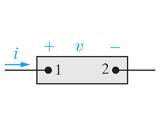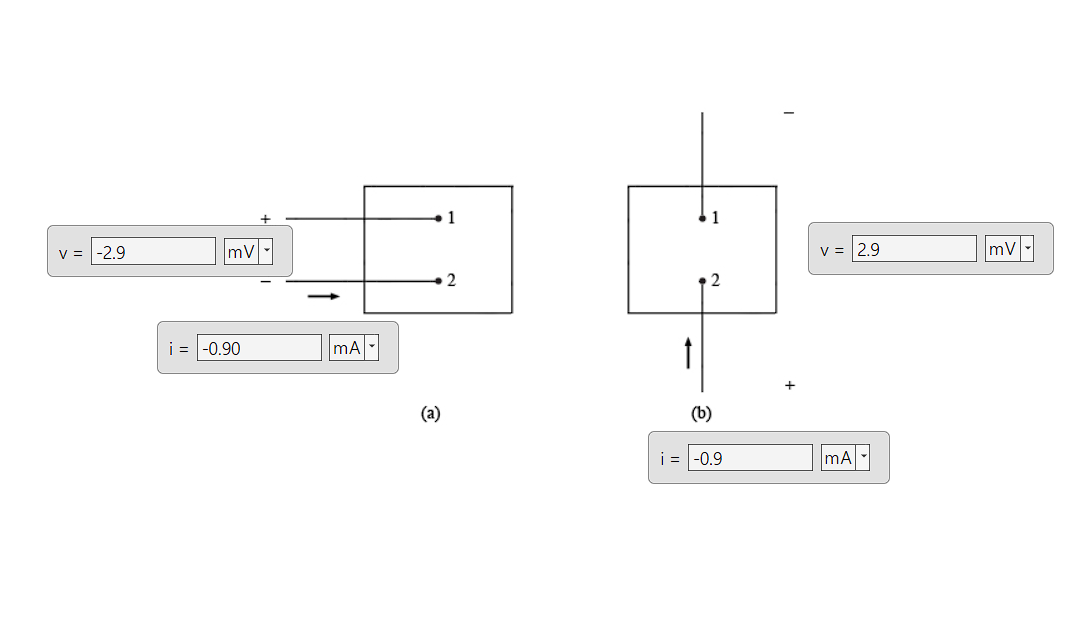 Determine the voltage (v) and current (i) as shown in the figures below. Assume that the voltage drop between terminals 1 and 2 is Vx = -2.9 mV and that the current entering terminal 1 is Ix = 0.90 mA.