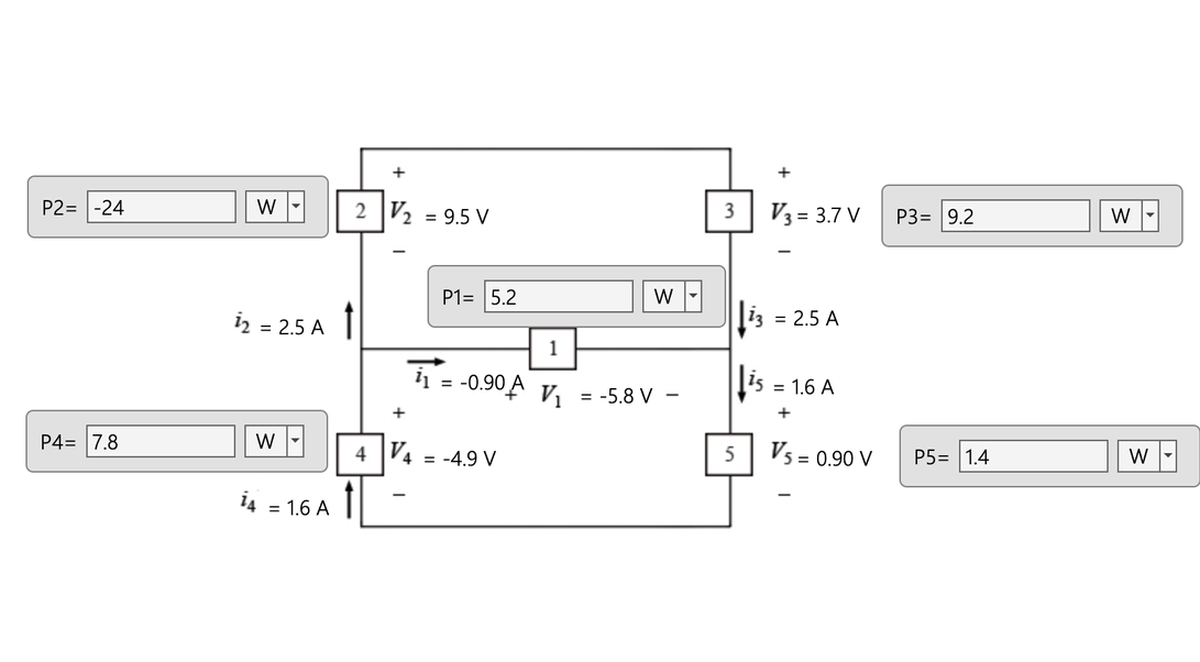 Consider the circuit below. Confirm that the power balances by calculating the power absorbed or delivered by each element. In your calculations use V1 = -5.8 V, V2 = 9.5 V, V3 = 3.7 V, V4 = -4.9 V, V5 = 0.90 V, i1 = -0.90 A, i2 = 2.5 A, i3 = 2.5 A, i4 = 1.6 A, and i5 = 1.6 A.